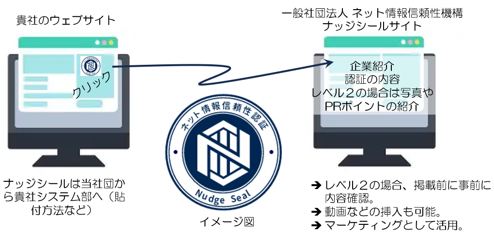 - 認証を得た組織は、自社サイト上に貼られたナッジシールをクリックすることで、登録日や有効期限、登録リスト、審査内容などを確認することができます。利用者も同様に確認できます。