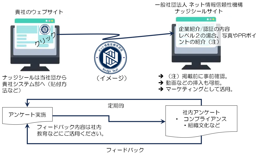 - 認証を得た組織は、自社サイト上に貼られたナッジシールをクリックすることで、登録日や有効期限、登録リスト、審査内容などを確認することができます。利用者も同様に確認できます。
